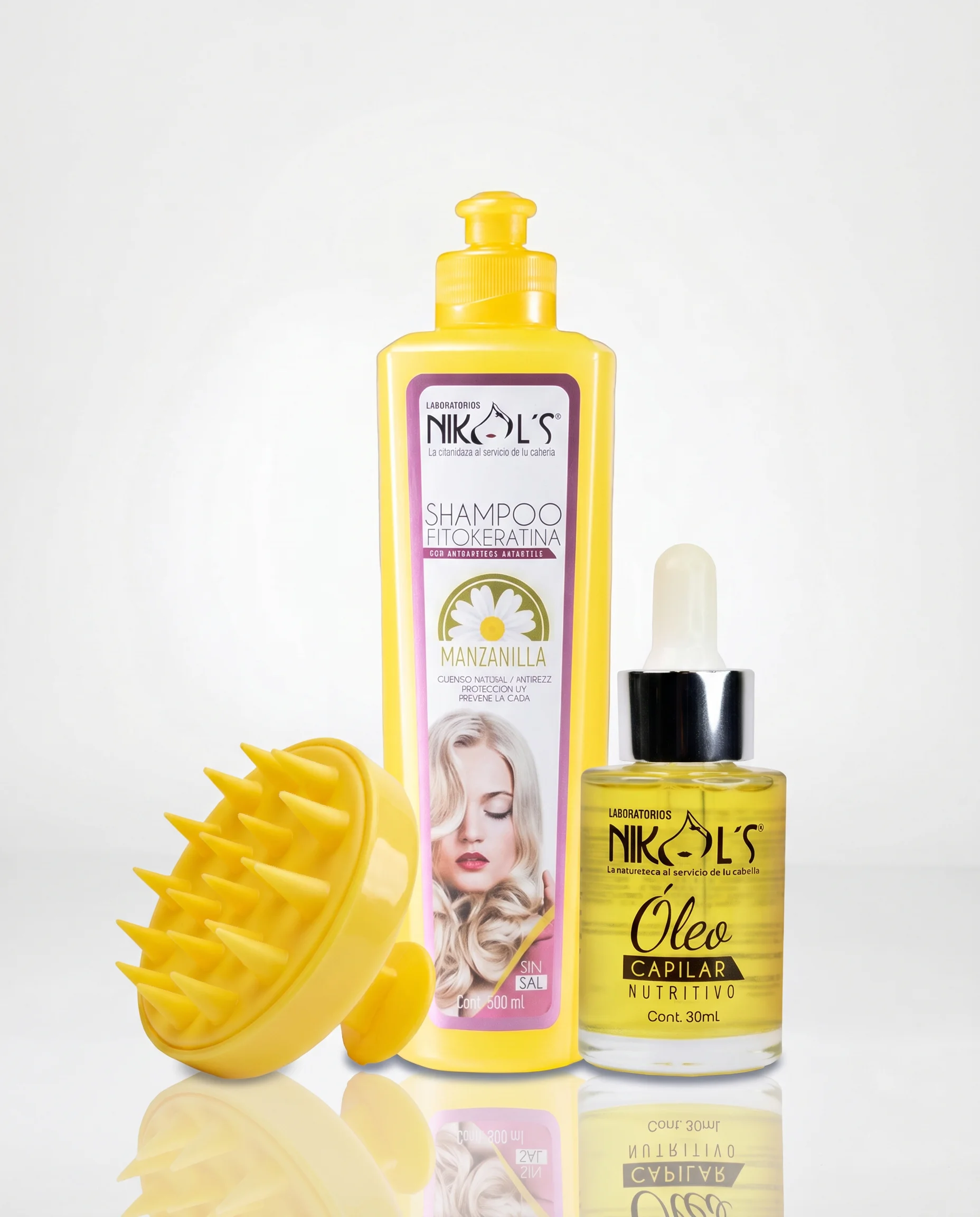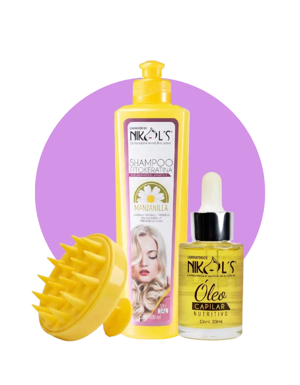 Kit capilar ideal para personas con poco tiempo que quieren un cabello hidratado bonito y con brillo gracias al shampoo de manzanilla, óleo nutritivo y masajeador capilar