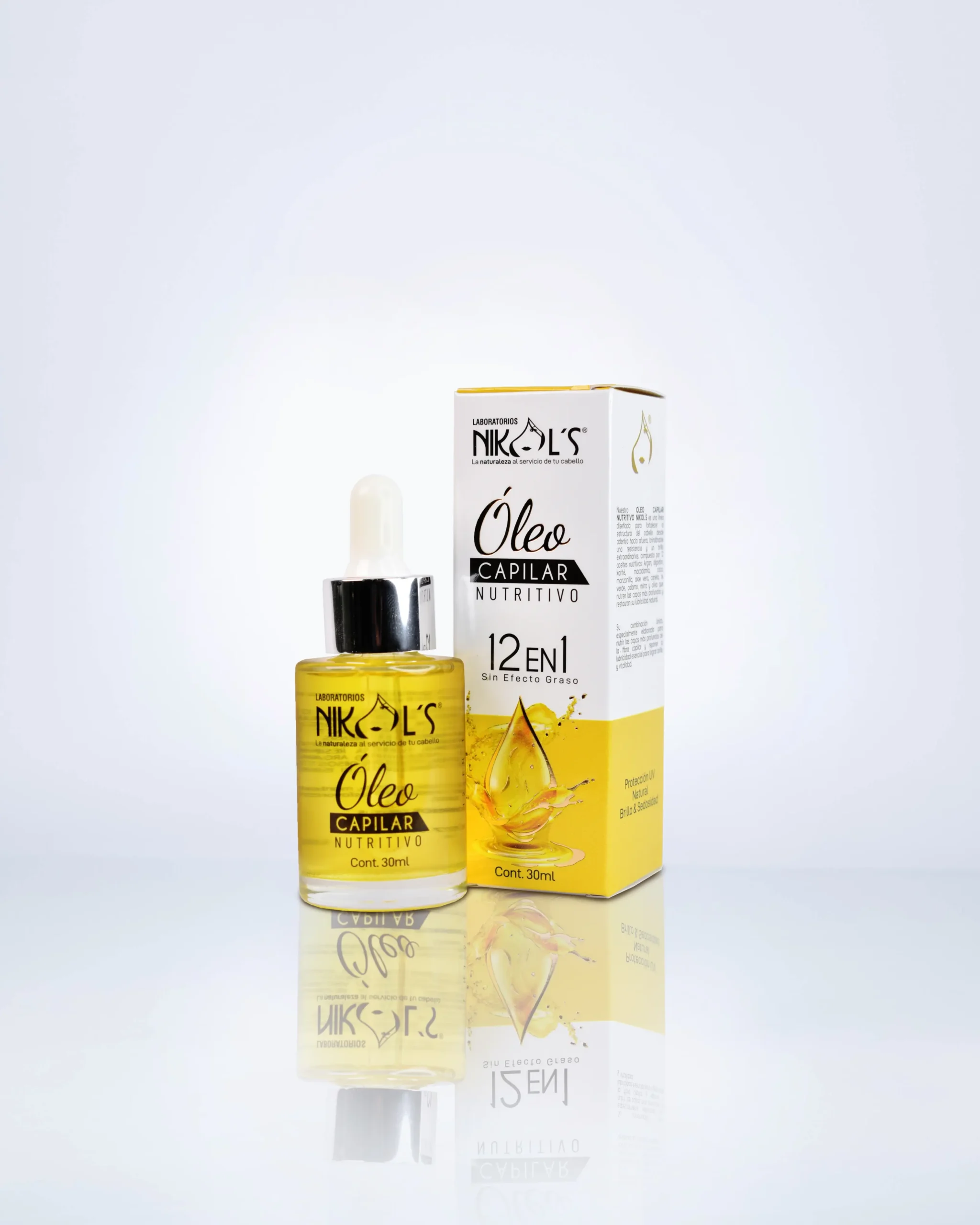 El Óleo Capilar Nikols con 12 aceites nutritivos repara, nutre y protege el cabello frágil, opaco y dañado, aportando brillo, suavidad y control del encrespamiento.